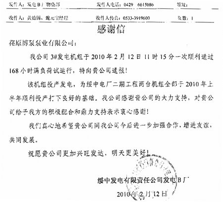 日前,綏中發(fā)電有限責(zé)任公司發(fā)電B廠發(fā)來感謝信,通報了我公司供貨的2000VZNM型立式循環(huán)水泵順利通過168小時滿負荷試運行, 順利發(fā)電。綏中發(fā)電有限責(zé)任公司發(fā)電B廠,為2X1000MW超